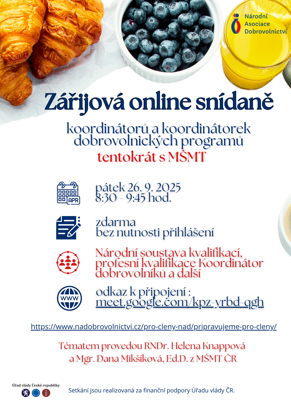 Přijměte naši pozvánku na zářijovou online snídani koordinátorů dobrovolnických programů, která tentokrát proběhne s přispěním Ministerva školství, mládeže a tělovýchovy k tématu Národní soustava kvalifikací. Pokryjeme také témata profesních kvalifikací - např. koordinátor dobrovolníků.